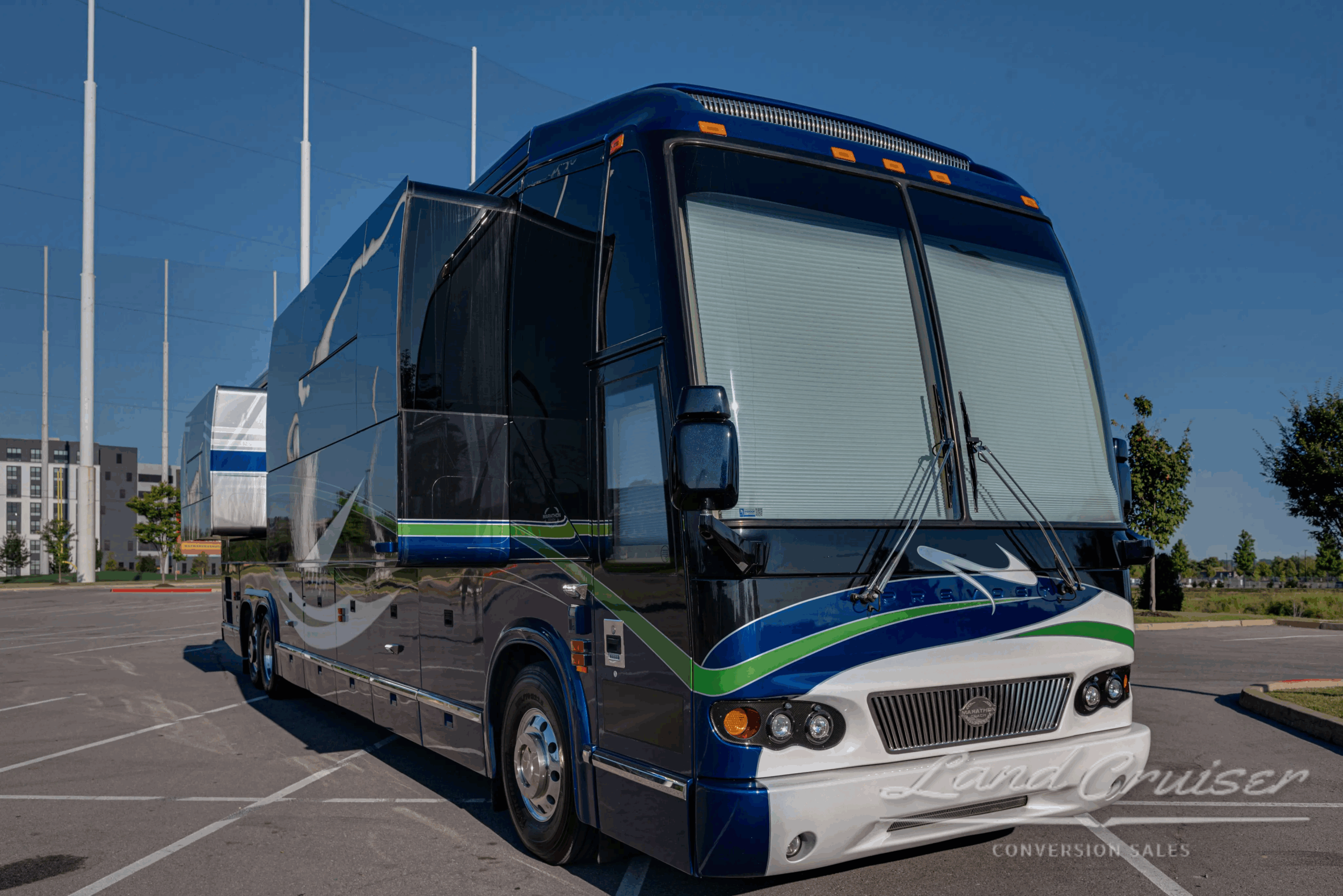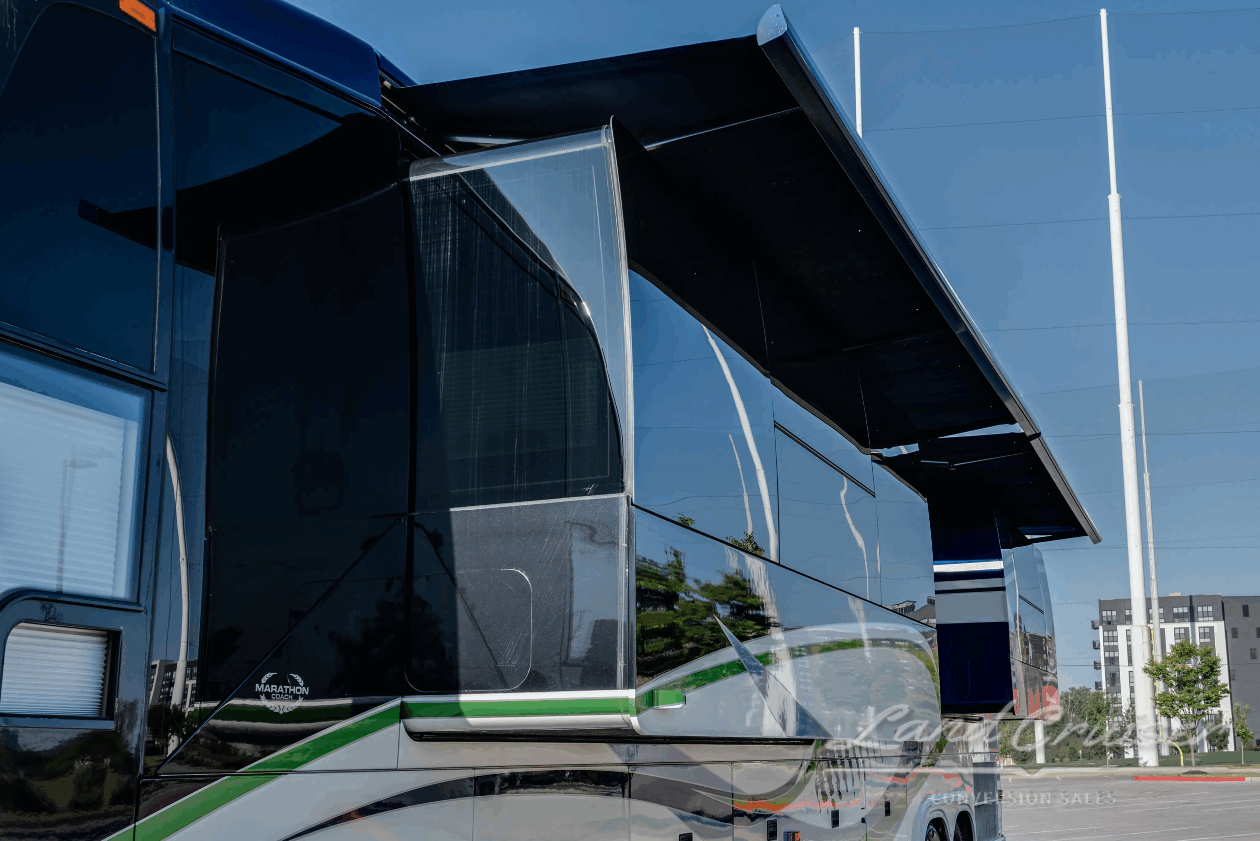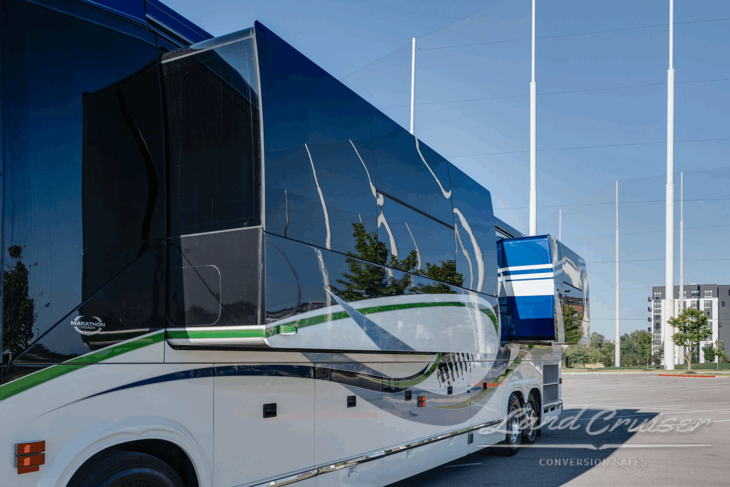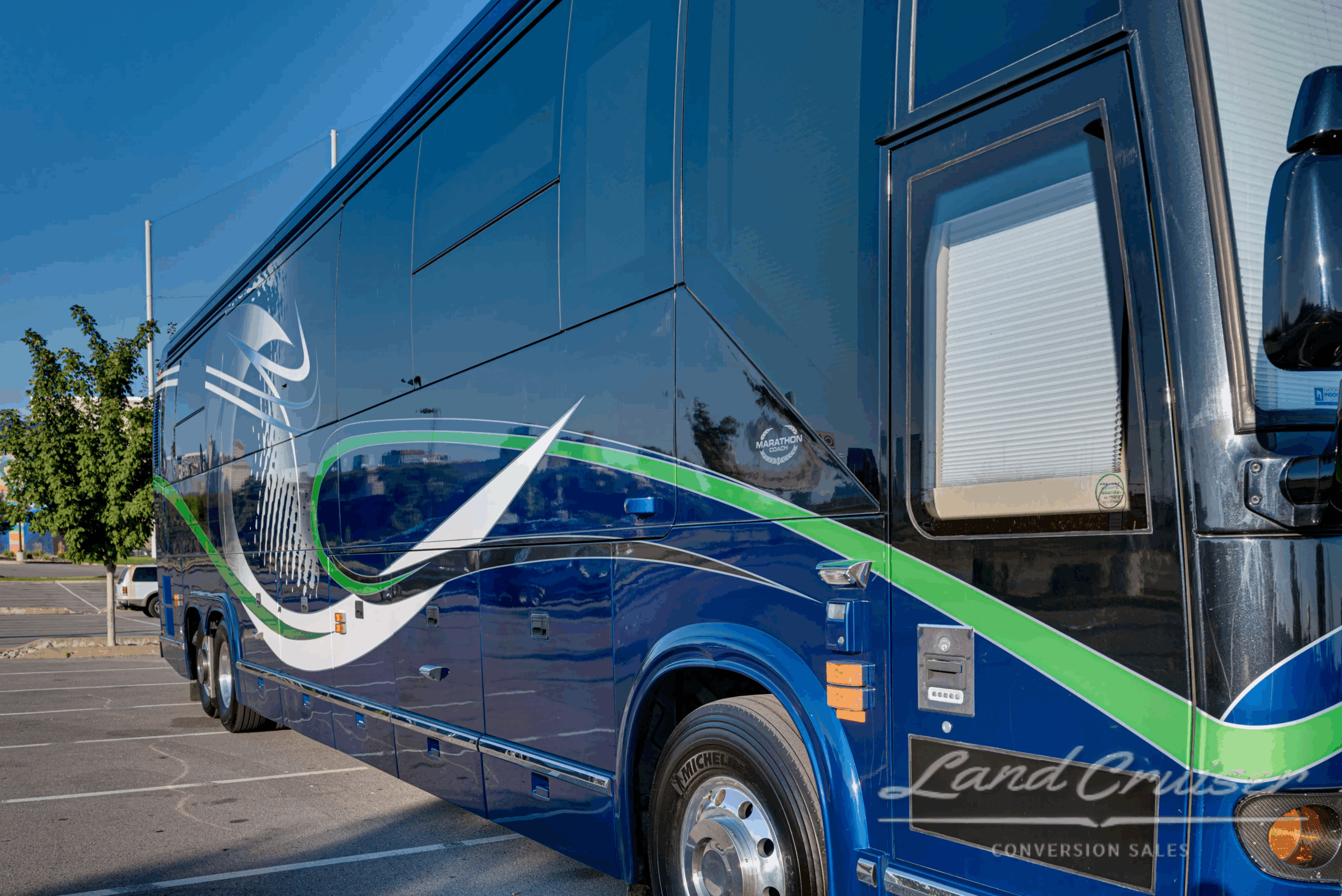 The 2009 Prevost H345 Marathon Coach 1174 is a luxury quad-slide motorhome conversion built for comfort, independence, and extended travel. Powered by a 14.0L Series 60 Detroit engine and featuring Marathon’s Jefferson H4-J floor plan, this premium coach combines elegant residential styling with high-end touring capability. Inside, the layout offers a king-sized rear suite, mid-walk-in wardrobe, and full-sized stacked washer/dryer—making it ideal for full-time living or long-haul travel. A beautifully appointed galley with premium appliances, spacious living area, and multiple Crestron-controlled AV zones create a refined onboard experience.