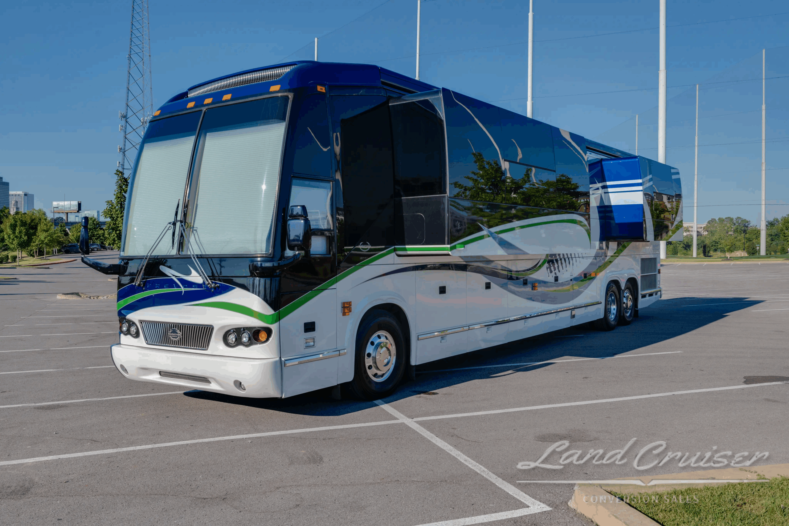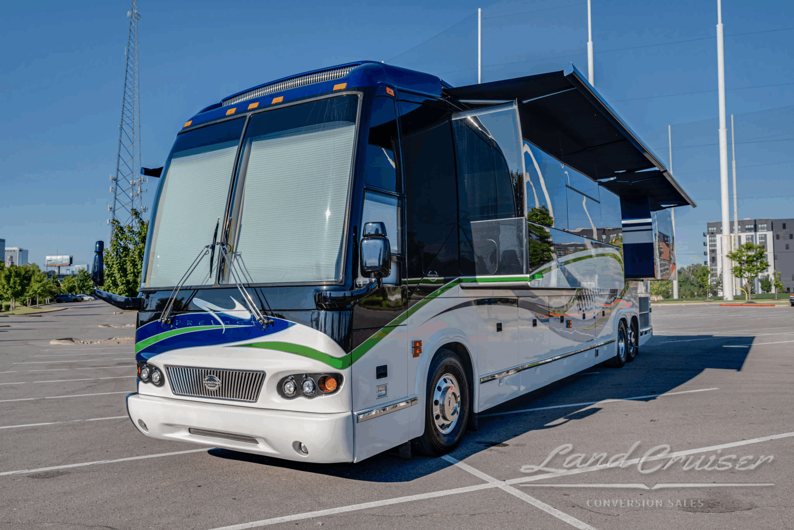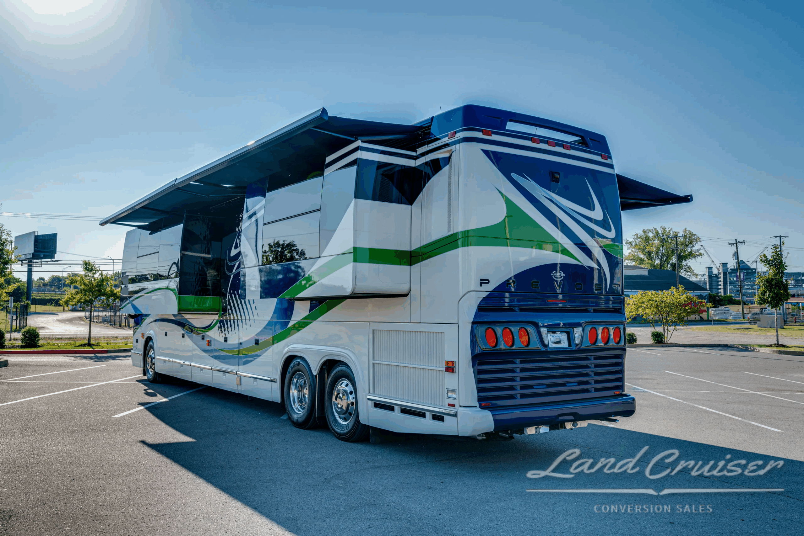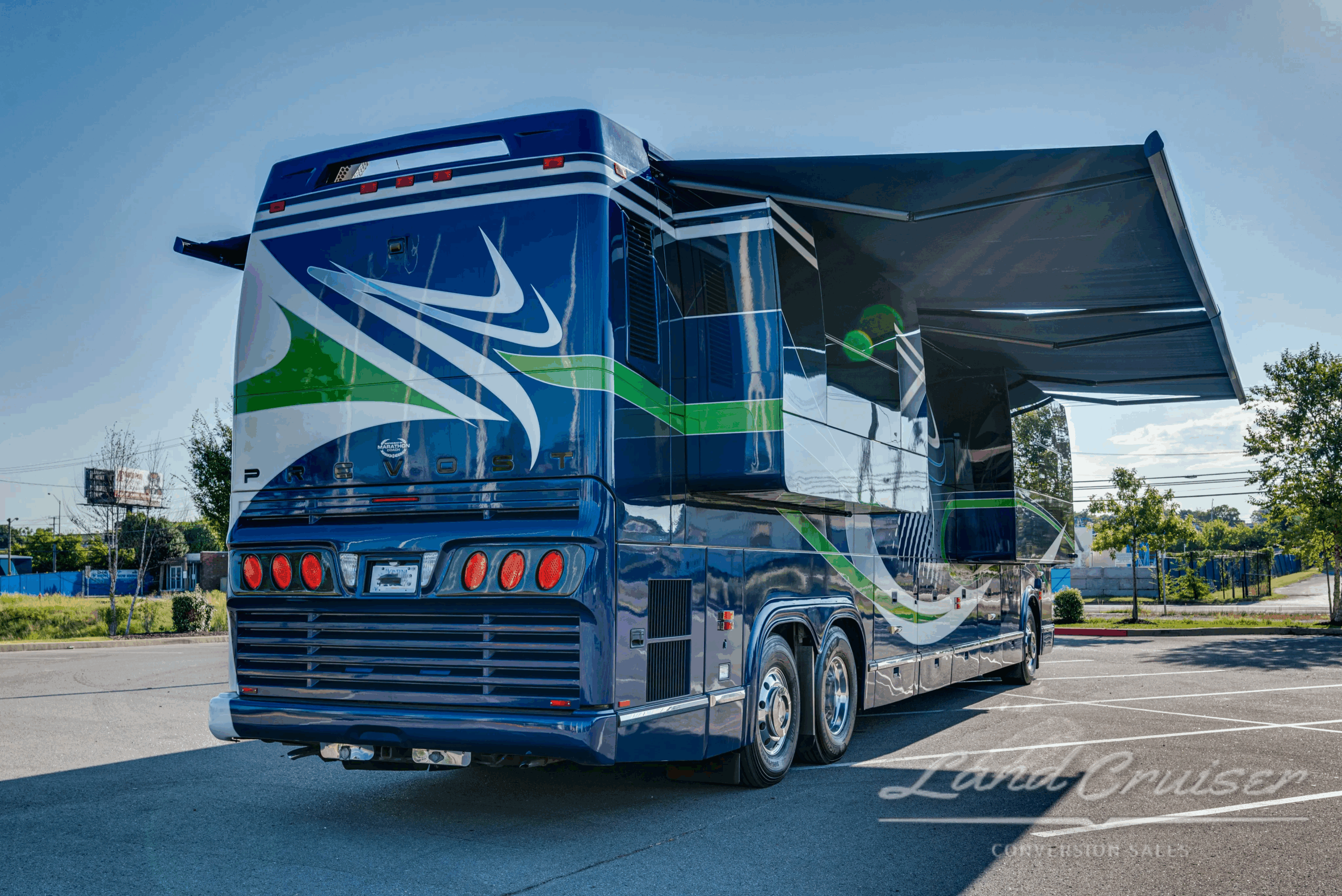 The 2009 Prevost H345 Marathon Coach 1174 is a luxury quad-slide motorhome conversion built for comfort, independence, and extended travel. Powered by a 14.0L Series 60 Detroit engine and featuring Marathon’s Jefferson H4-J floor plan, this premium coach combines elegant residential styling with high-end touring capability. Inside, the layout offers a king-sized rear suite, mid-walk-in wardrobe, and full-sized stacked washer/dryer—making it ideal for full-time living or long-haul travel. A beautifully appointed galley with premium appliances, spacious living area, and multiple Crestron-controlled AV zones create a refined onboard experience.