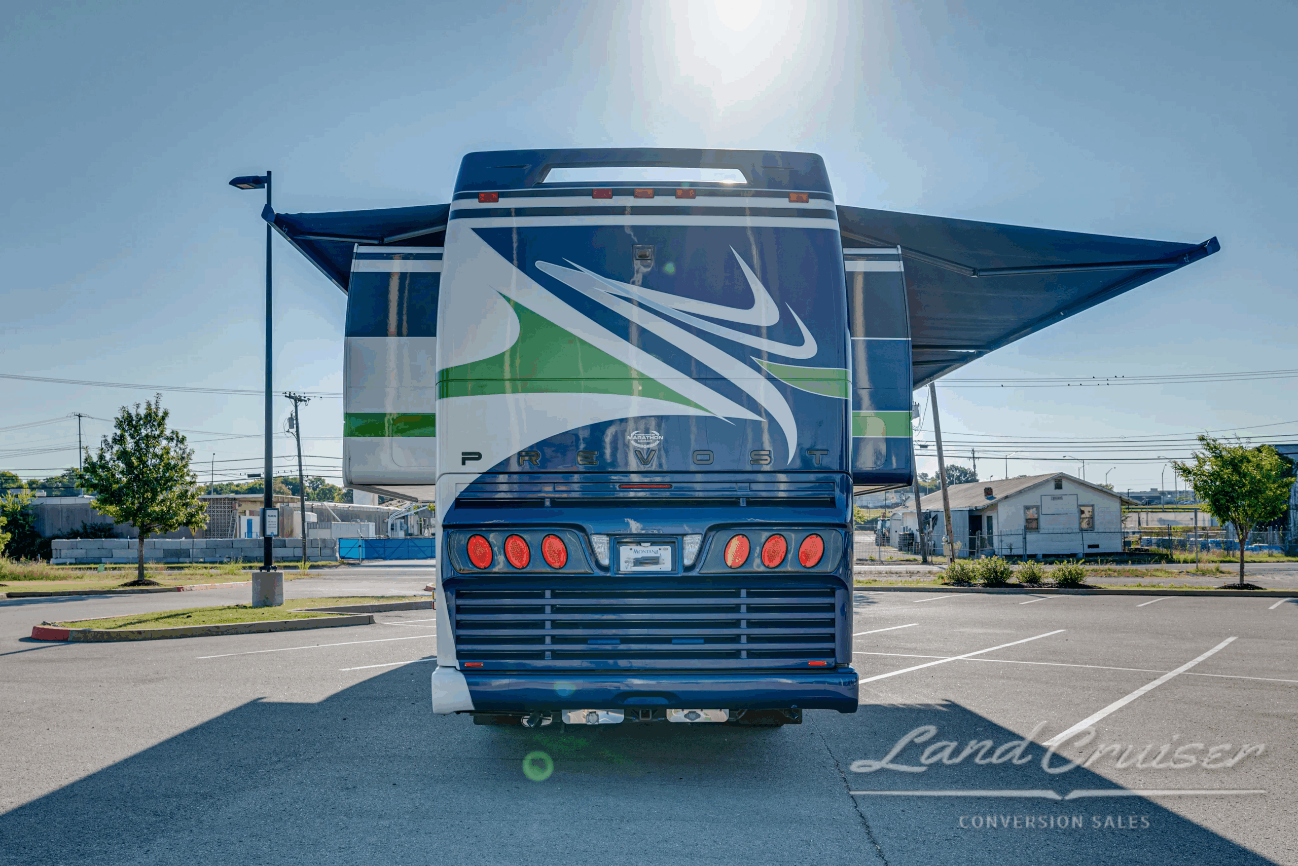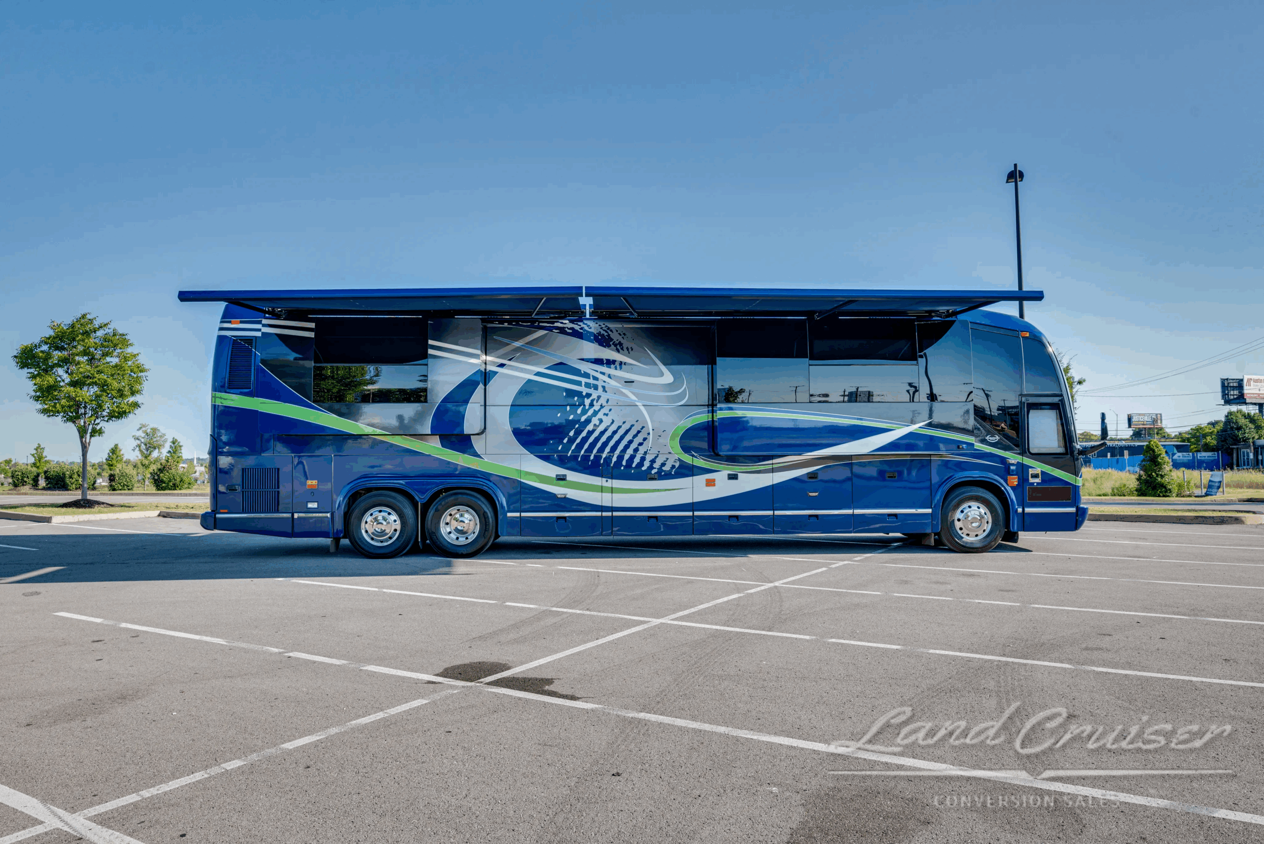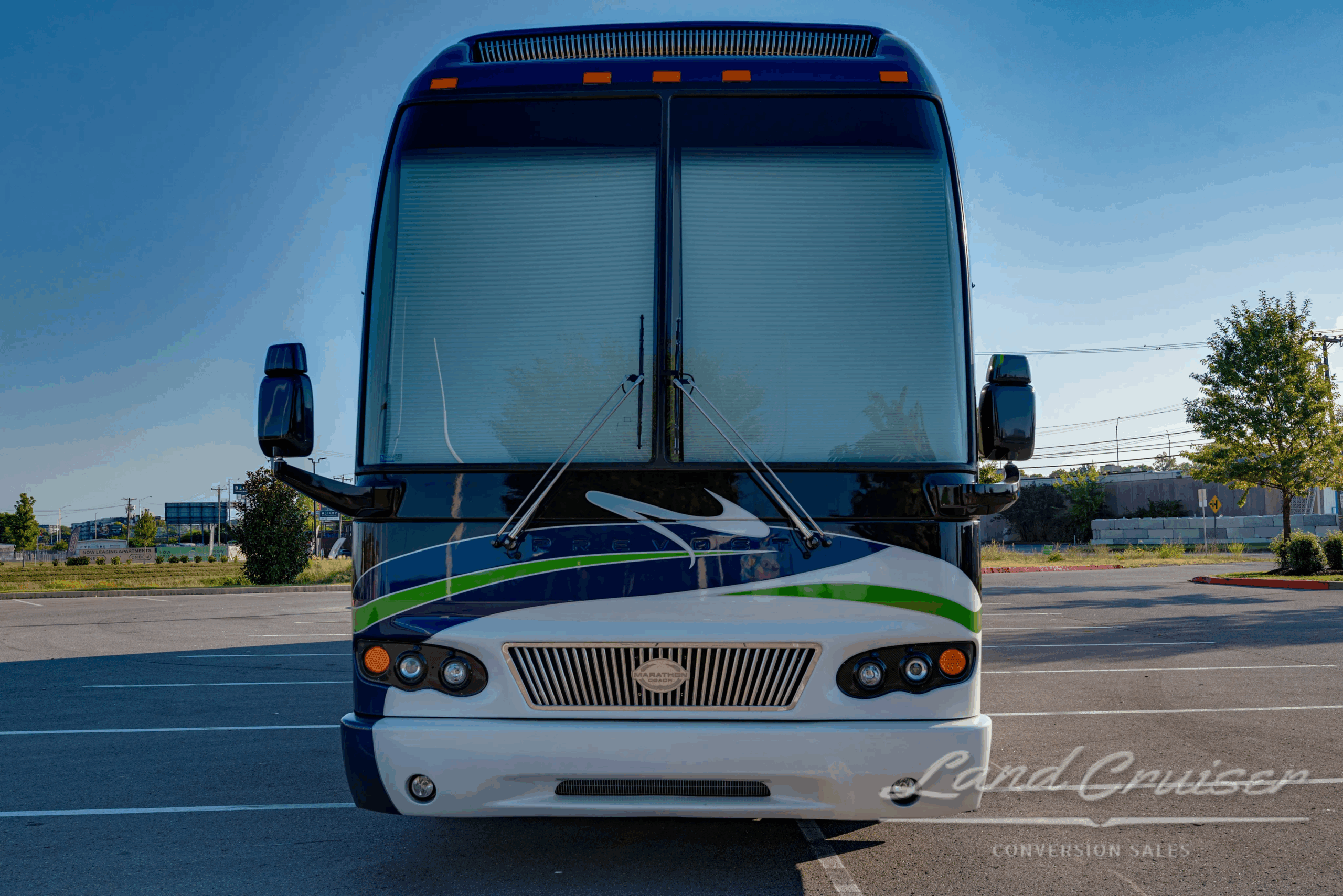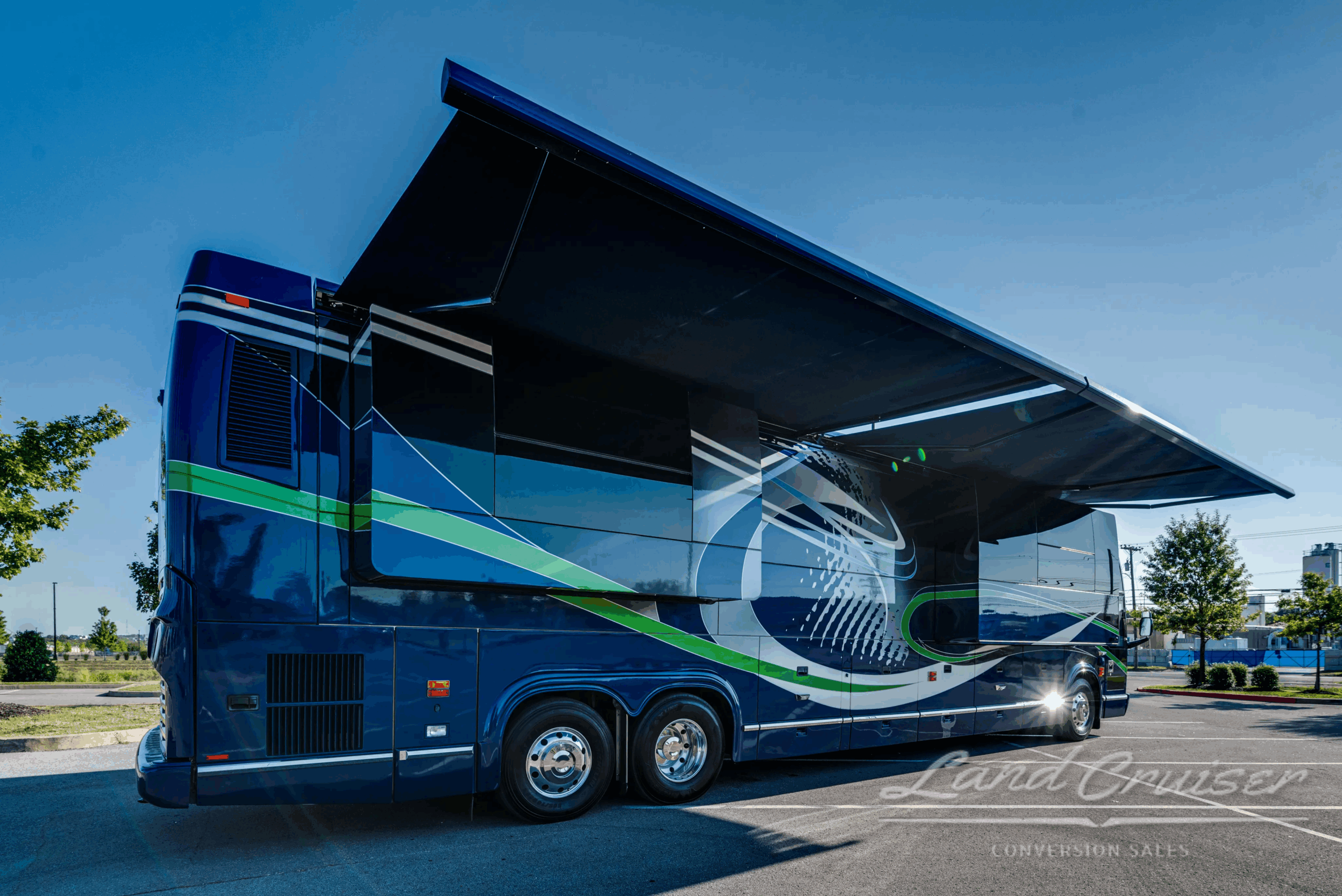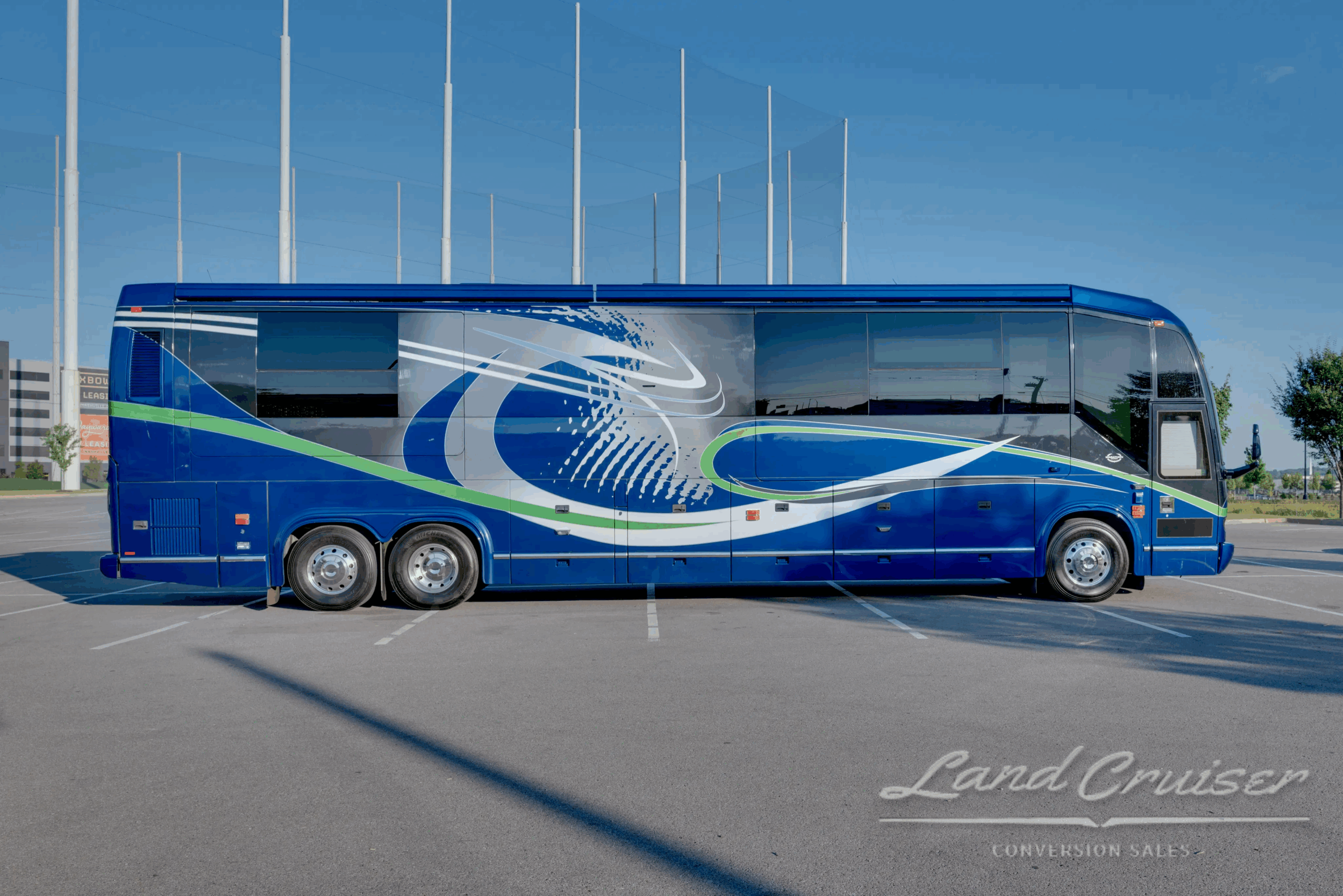 The 2009 Prevost H345 Marathon Coach 1174 is a luxury quad-slide motorhome conversion built for comfort, independence, and extended travel. Powered by a 14.0L Series 60 Detroit engine and featuring Marathon’s Jefferson H4-J floor plan, this premium coach combines elegant residential styling with high-end touring capability. Inside, the layout offers a king-sized rear suite, mid-walk-in wardrobe, and full-sized stacked washer/dryer—making it ideal for full-time living or long-haul travel. A beautifully appointed galley with premium appliances, spacious living area, and multiple Crestron-controlled AV zones create a refined onboard experience.